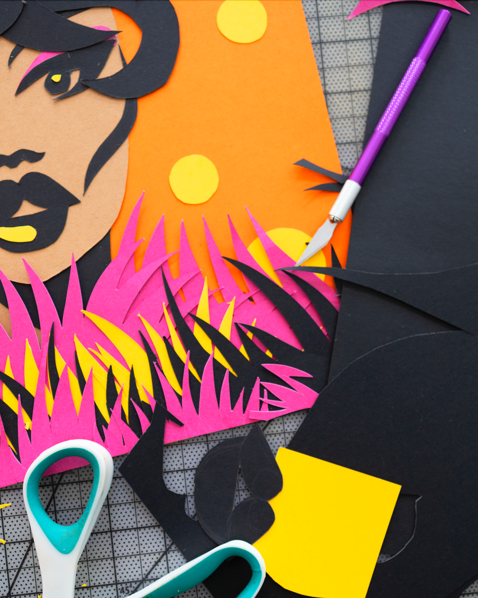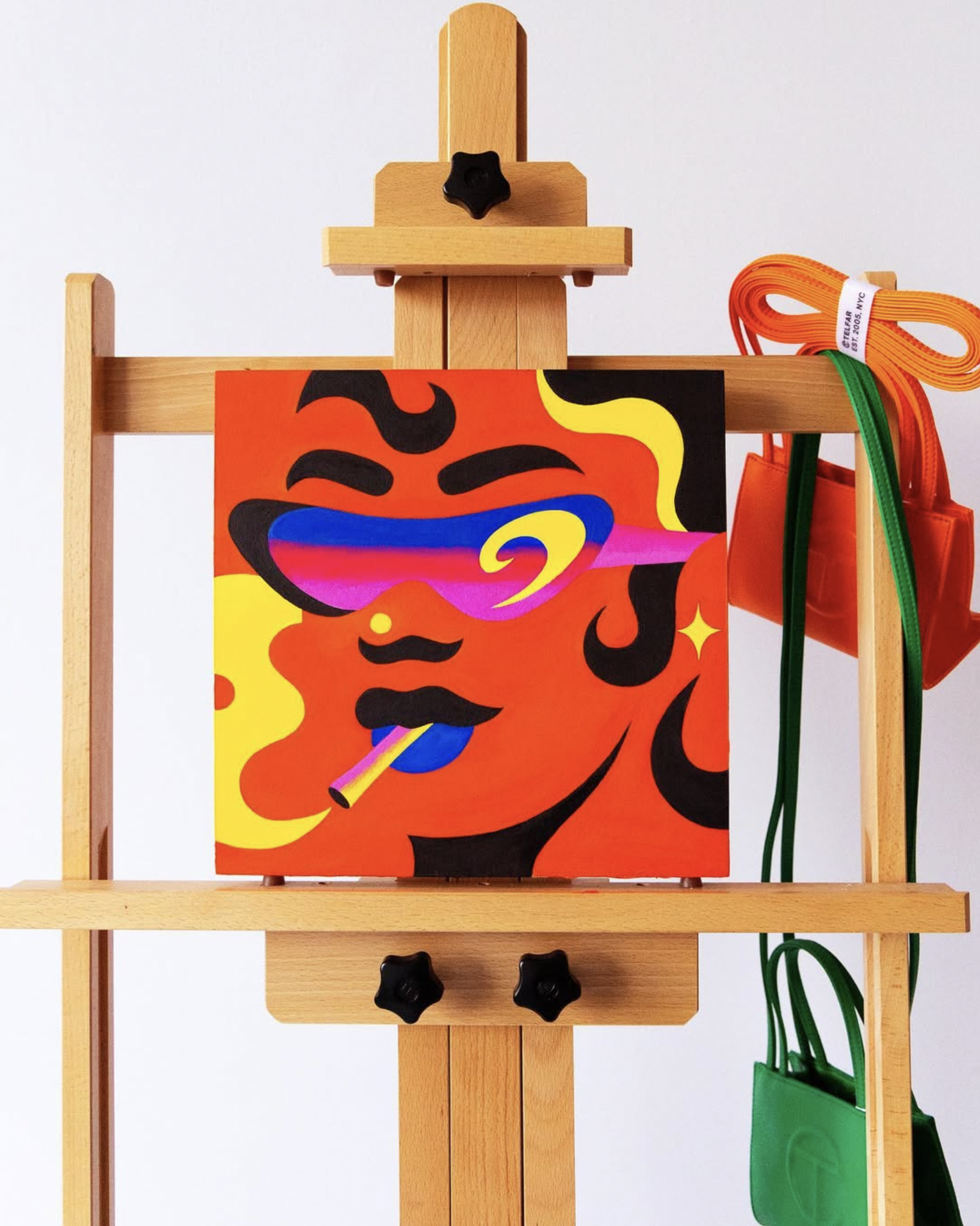 Combining gouache, collage, and digital techniques, she creates layered, dimensional works that explore texture, movement, and visual rhythm. Her immersive worlds highlight individuality, personal power, and self-acceptance.