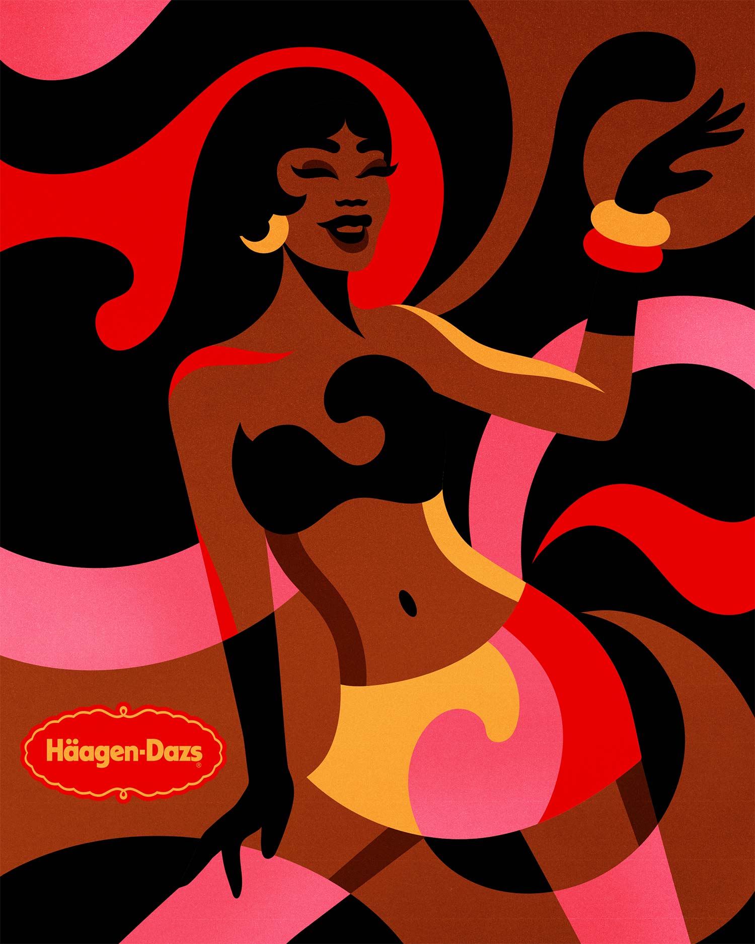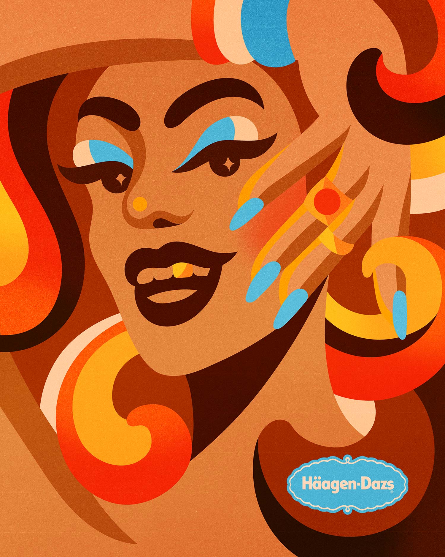 Using Häagen-Daz's newest innovation as a muse, the Butter Cookie Cone is translated into powerful art. Inspired by the thick and buttery cookie cone, indulgent cookie pieces, and velvety ice cream, each illustration brings new flavors to life in JPB'S signature style.