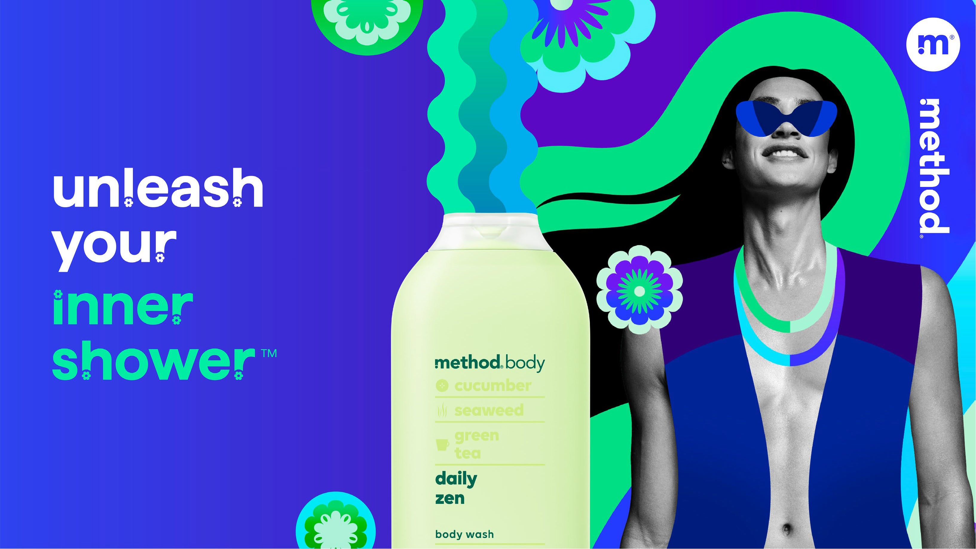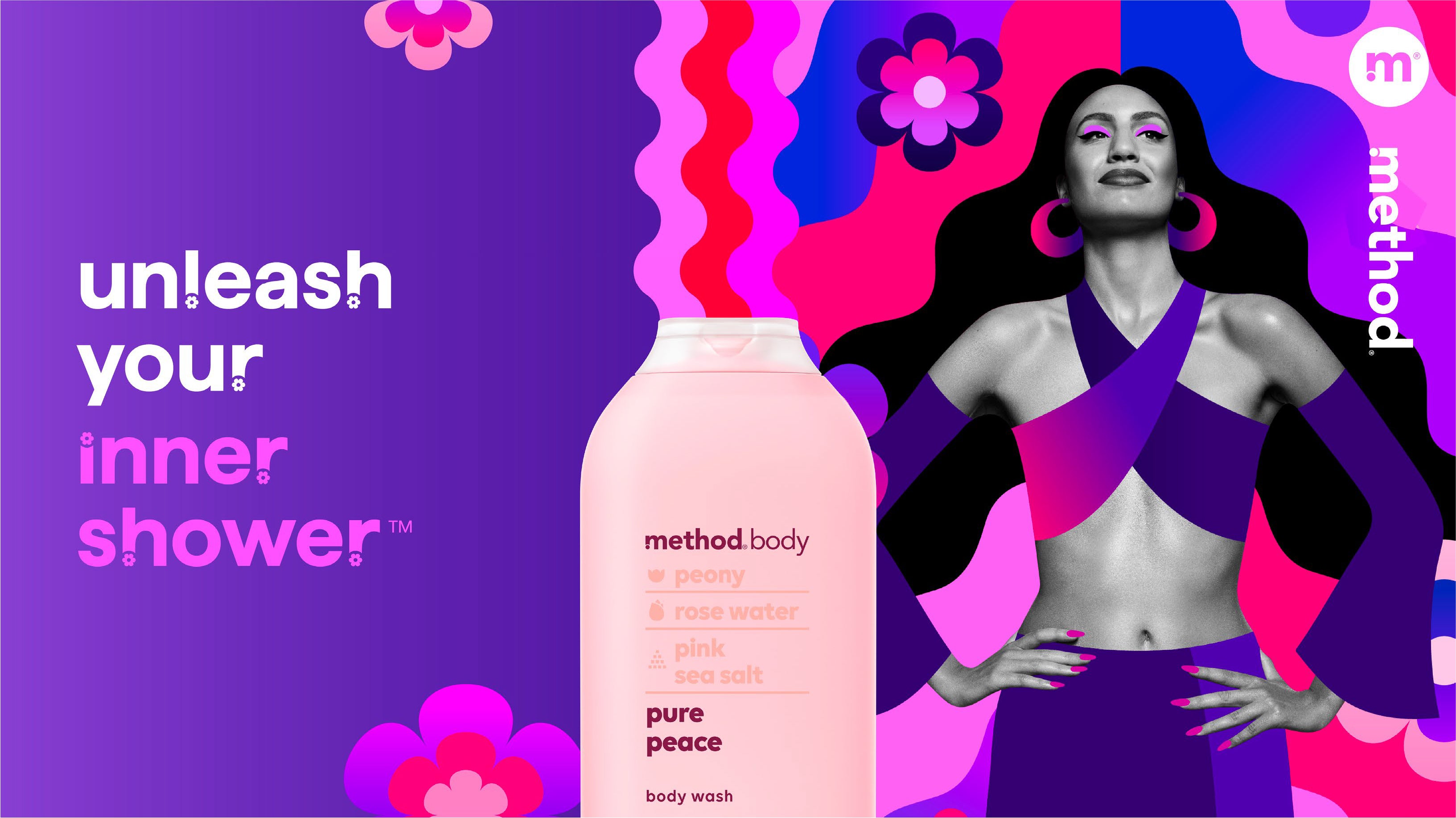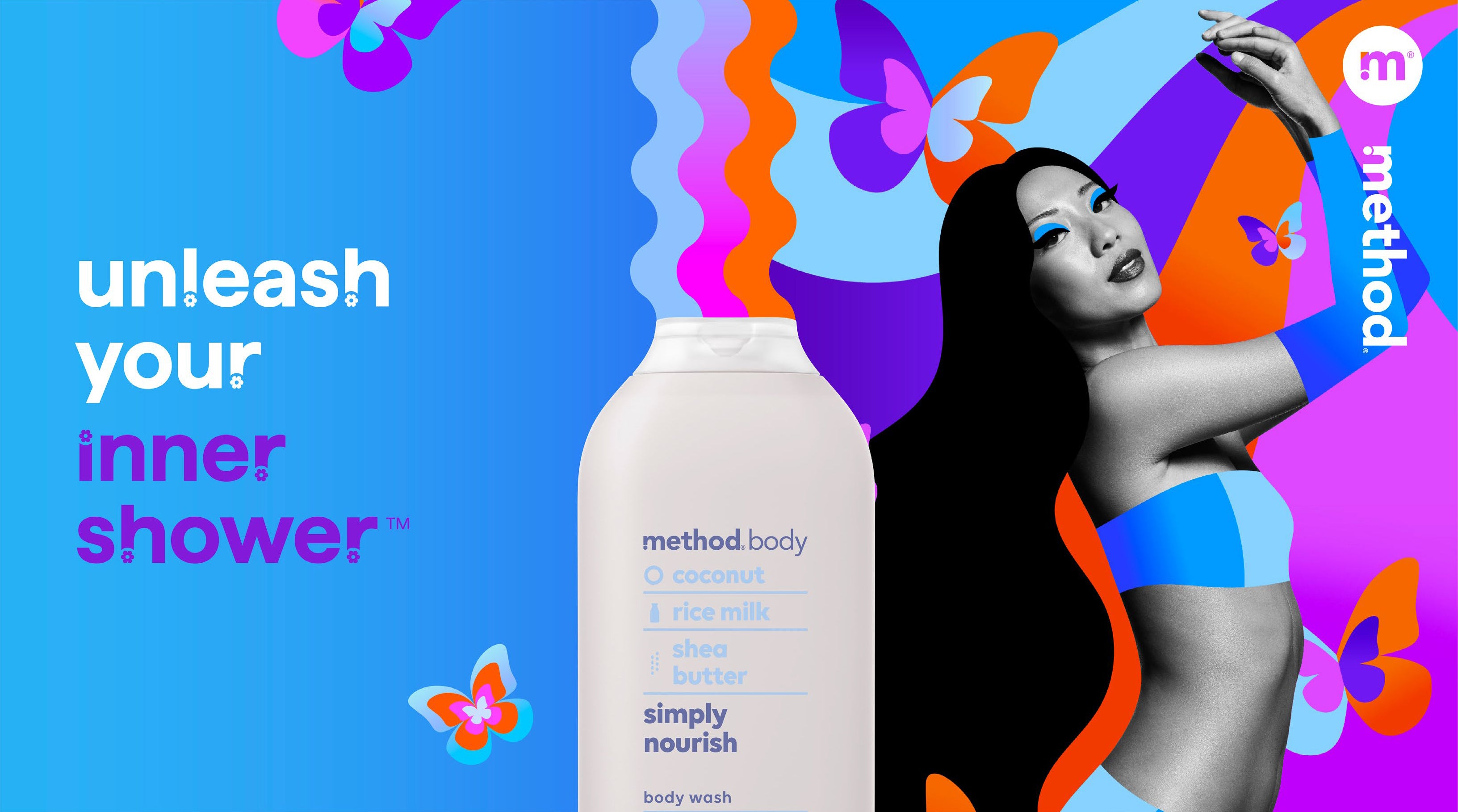 Campaign art for Method's 'Shower Power' campaign highlighting their new body and hair care line designed to give feel-good vibes all day, everyday.