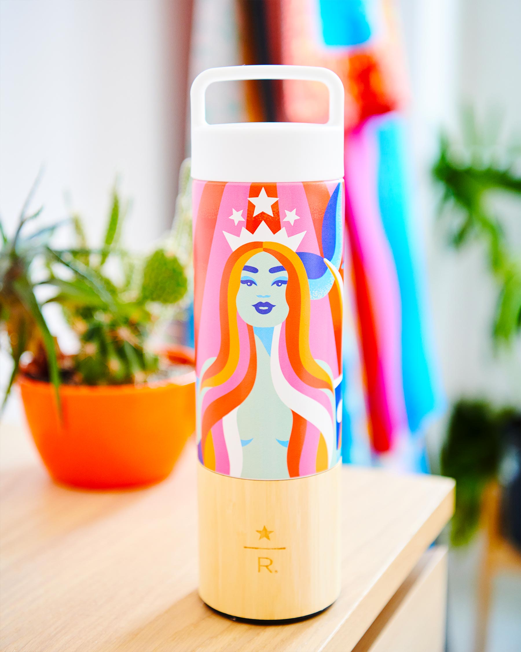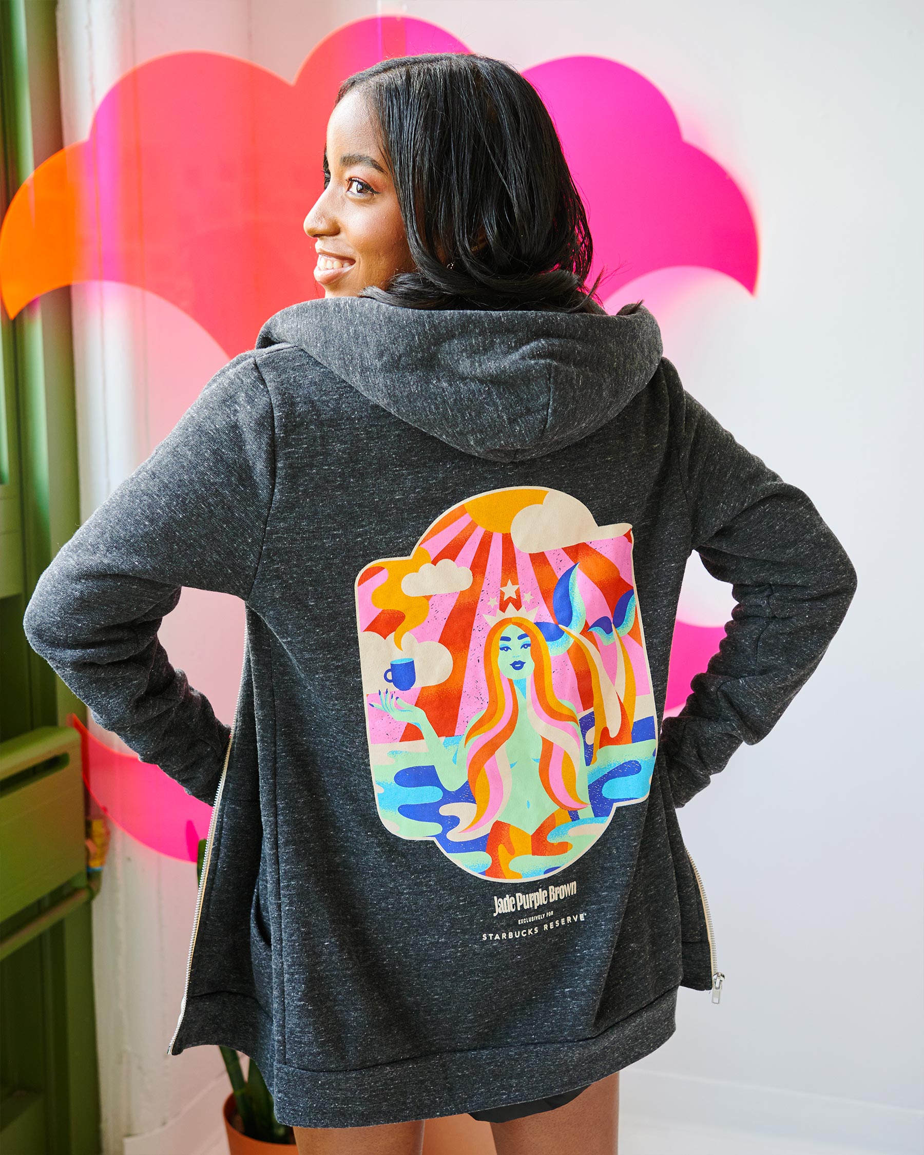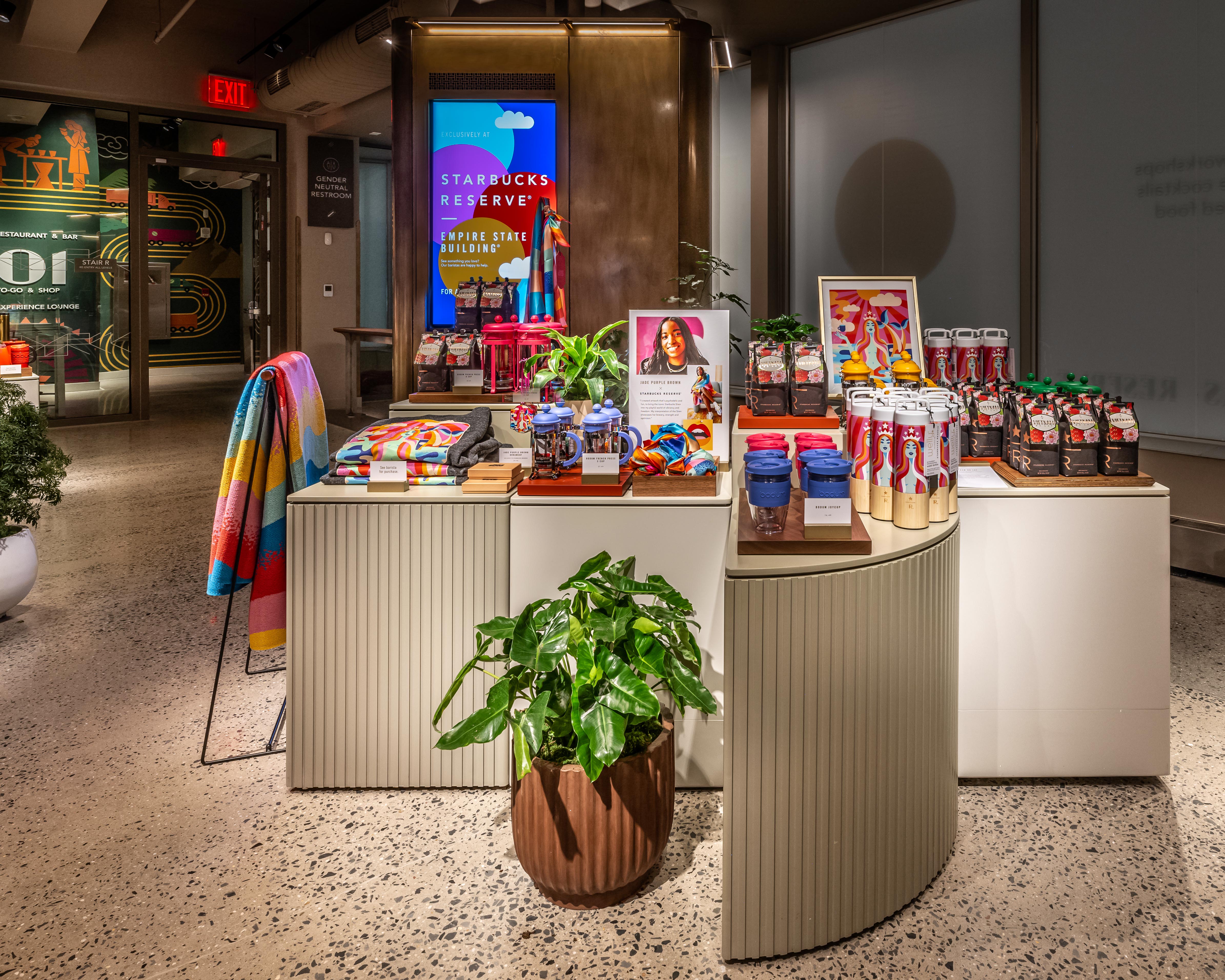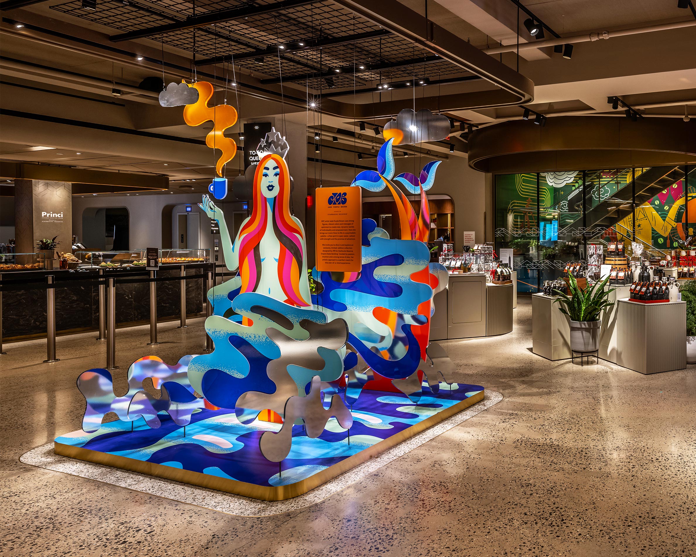 In a place that honors a city filled with art, Starbucks selected local artist Jade Purple Brown to bring this special store to life by asking her to redesign their iconic Siren logo. Through her own vision of vibrancy and freedom, Jade's 3D interpretation welcomes visitors at the entrance and showcases the Siren's bravery, strength, and optimism. She also created a collection of merchandise on sale in the Concourse level shop.